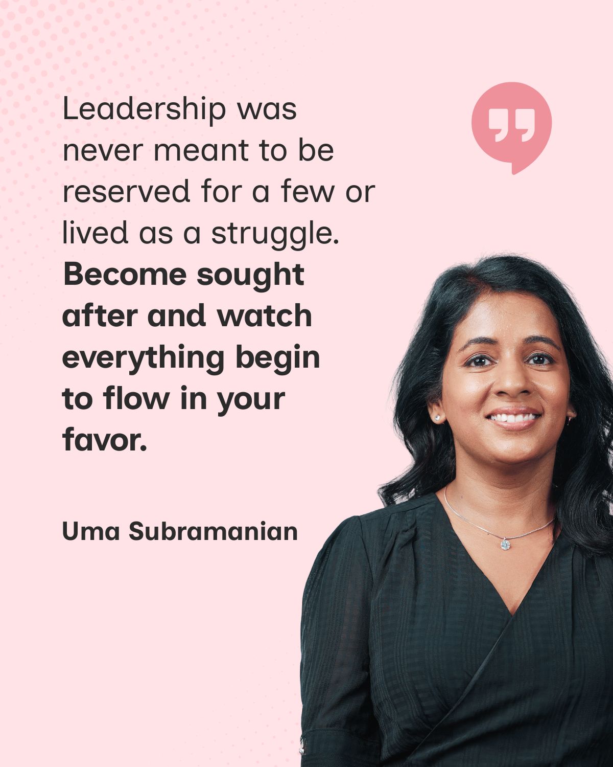 Today, Uma coaches and mentors professionals around the world to lead with confidence, communicate with clarity, and create careers that flow with intention rather than hustle. She is a certified executive coach, speaker, and corporate facilitator with Maxwell Leadership and the creator of The Sought-After Leader Experience™, a transformational ecosystem that equips professionals with the skills and mindset to thrive and lead in a rapidly evolving world.
